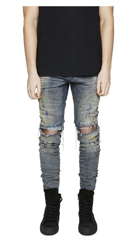 Featuring classic five-pocket styling, a modern slim fit, and allover paint-splatter detailing, these jeans feature distressing at the knees.